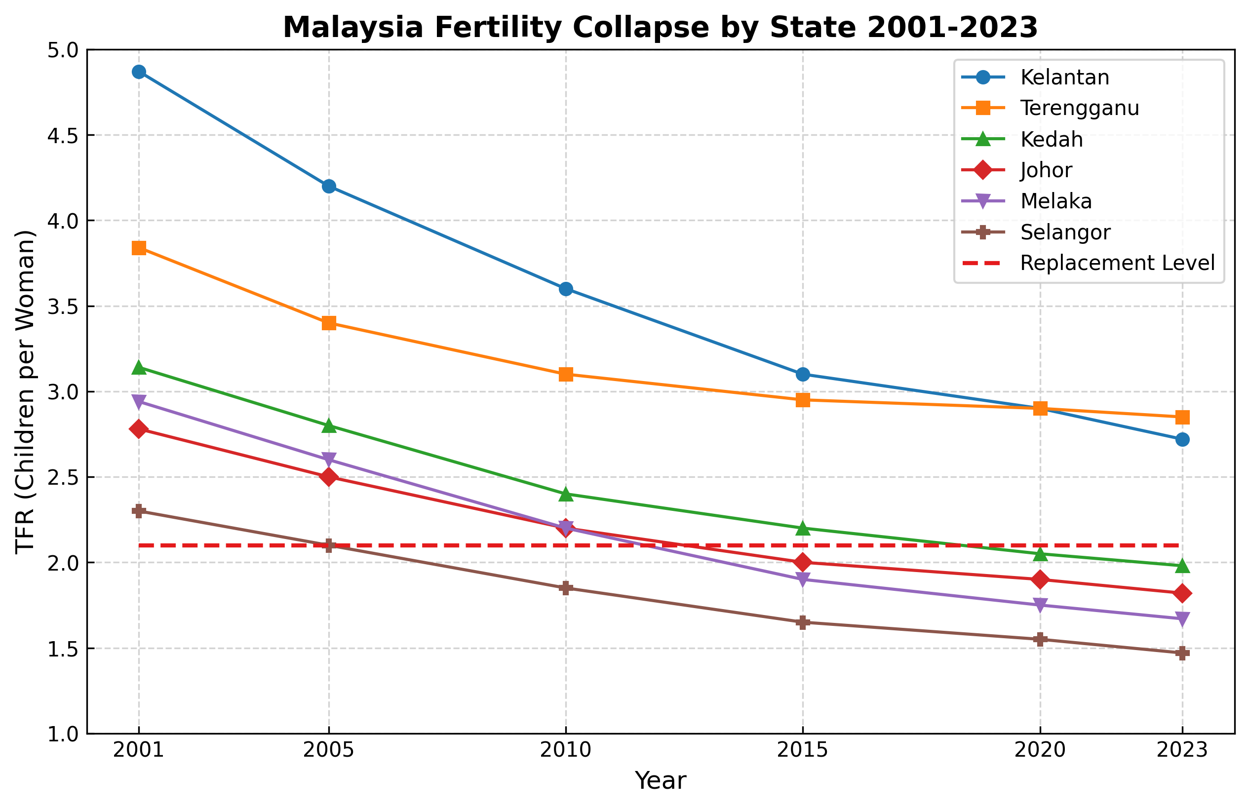 Even traditionally high-fertility rural states haven't been spared. Kelantan—historically Malaysia's baby-making champion—saw its fertility rate crash 44% from 4.87 children per woman in 2001 to 2.72 in 2023.