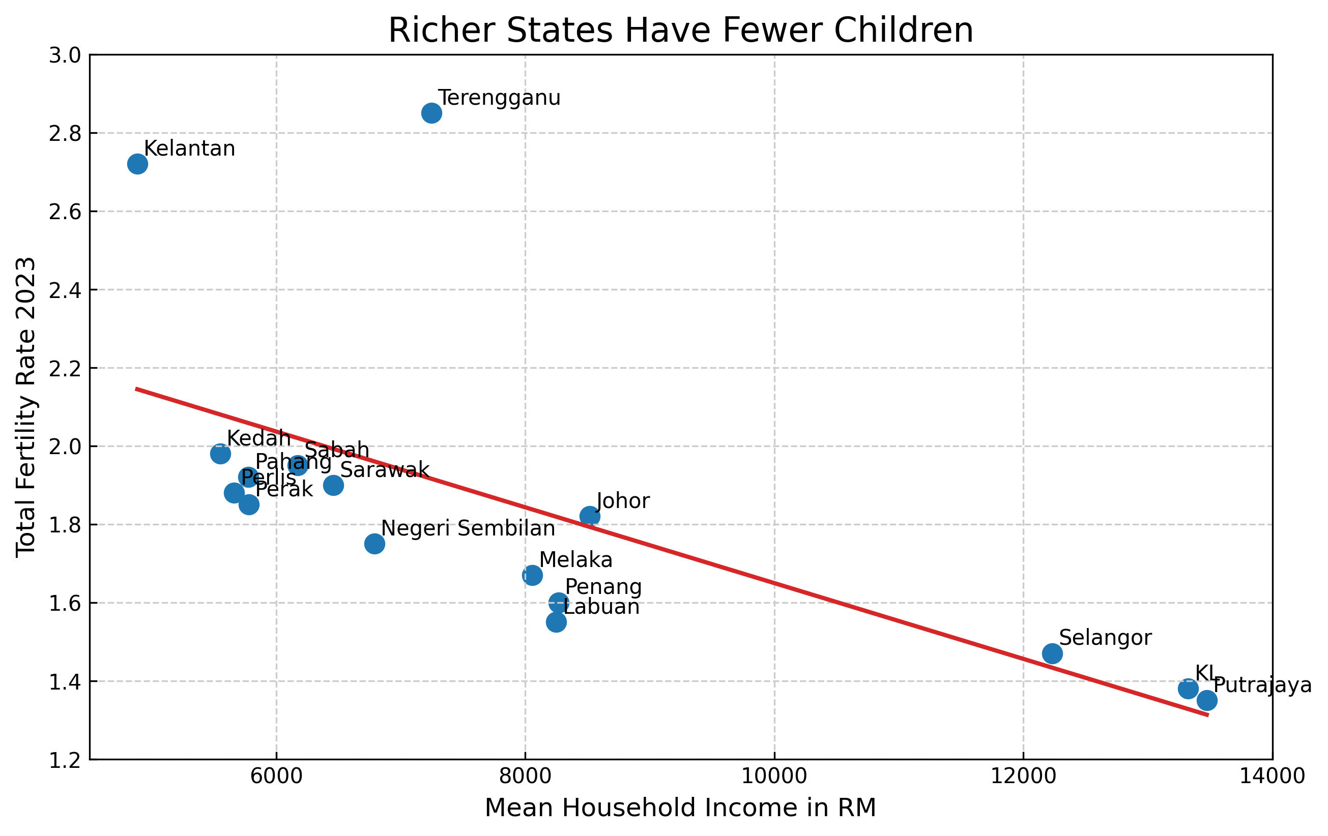 | State | Mean Monthly Income (RM) | TFR 2023 |